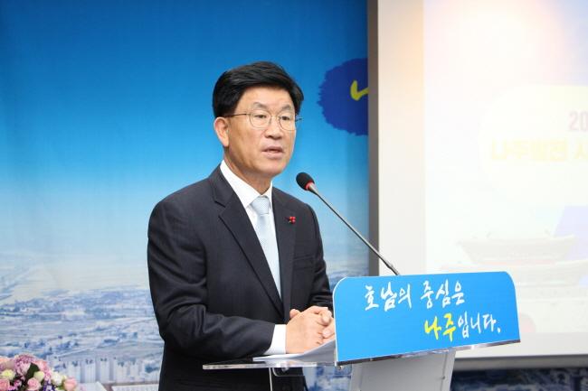 ° ½ÃÀåÀº ¡°¹Î¼± 7±â 1³â 6°³¿ù°£ÀÇ ¼º°ú¸¦ ÅëÇØ ³ªÁÖÀÇ »õ õ³â »õ ½Ã´ëÀÇ µµ¾àÀ» À§ÇÑ Áغñ´Â ³¡³µ´Ù¡±¸ç ¡°±¹°¡ Çõ½Å¼ºÀå 8´ë ¼±µµ»ç¾÷ÀÎ Â÷¼¼´ë ¿¡³ÊÁö½Å»ê¾÷À» ¹ÙÅÁÀ¸·Î ´ëÇѹα¹ ¹Ì·¡¸¦ ÁÖµµÇÏ´Â ³ªÁÖ¸¦ ¸¸µé°Ú´Ù¡±°í ¸»Çß´Ù.