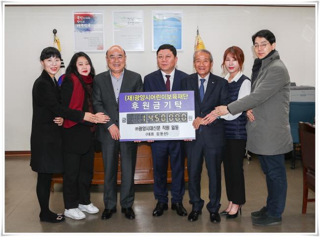 À̳¯ Çà»ç¿¡¼´Â ±¤¾ç»ó°øÈ¸ÀǼÒ(ȸÀå À̹鱸)¿¡¼ º¸À°Àç´Ü¿¡ 500¸¸ ¿øÀÇ ÈÄ¿ø±ÝÀ» ±âŹÇÏ¸ç ¾ÆÀ̵鿡 ´ëÇÑ »ç¶ûÀ» Àü´ÞÇß´Ù. ±¤¾ç»ó°øÈ¸ÀǼҴ 3³â ¿¬¼Ó 500¸¸ ¿øÀÇ ÈÄ¿ø±ÝÀ» ±âŹÇßÀ¸¸ç, À̹鱸 ȸÀåÀº ¾î¸°À̺¸À°Àç´Ü ÀÌ»ç·Îµµ Ȱµ¿ÇÏ¸ç ¡®¾ÆÀÌ ¾çÀ°Çϱâ ÁÁÀº µµ½Ã ±¤¾ç¡¯ ¸¸µé±â¿¡ Àû±Ø µ¿ÂüÇϰí ÀÖ´Ù.