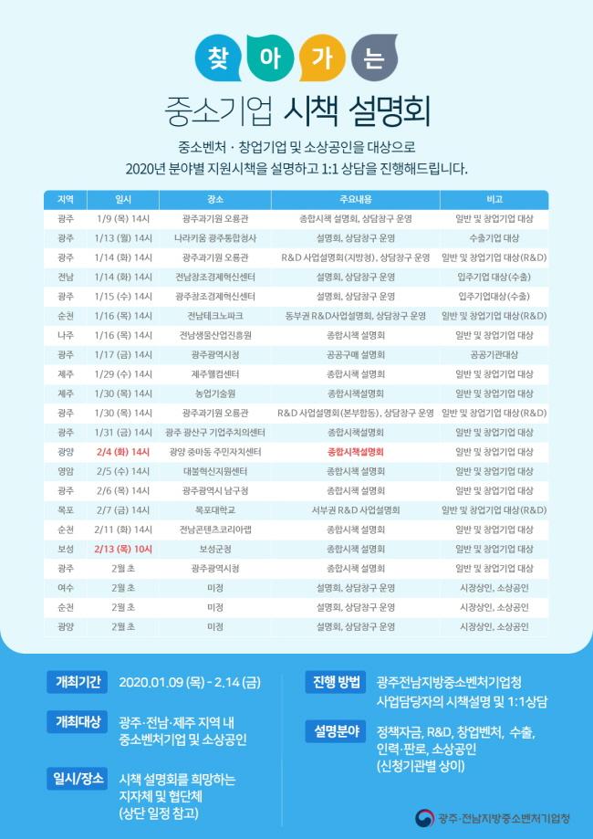 ±¤ÁÖÀü³²Áö¹æÁß¼Òº¥Ã³±â¾÷û(ûÀå ±è¹®È¯)Àº 1¿ù 9ÀÏ(¸ñ), 14½Ã¿¡ ±¤ÁÖ°ú±â¿ø ¿À·æ°ü¿¡¼ ¿¸®´Â¡¸¡®20³â Áß¼Ò?º¥Ã³±â¾÷, ¼Ò»ó°øÀÎ Áö¿ø»ç¾÷ Á¾ÇÕ¼³¸íȸ¡¹¸¦ ½ÃÀÛÀ¸·Î 2¿ù 14ÀÏ(±Ý)±îÁö ÃÑ 22ȸ¿¡ °ÉÃÄ ¡°Ã£¾Æ°¡´Â ¼³¸íȸ¡±¸¦ °³ÃÖÇÑ´Ù°í ¹àÇû´Ù.