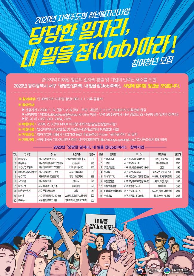 2020³â Áö¿ªÁÖµµÇü û³â ÀÏÀÚ¸® »ç¾÷ ?´ç´çÇÑ ÀÏÀÚ¸®, ³» ÀÏÀ» Àâ(Job)¾Æ¶ó!? »ç¾÷ ÀÏȯÀ¸·Î ÃßÁøµÇ´Â À̹ø ä¿ë ¹Ú¶÷ȸ´Â 2¿ù 5ÀϱîÁö Âü¿©¸¦ Èñ¸ÁÇϴ û³âµéÀÇ »çÀü½ÅûÀ» ¹Þ°í ÀÖ´Ù.