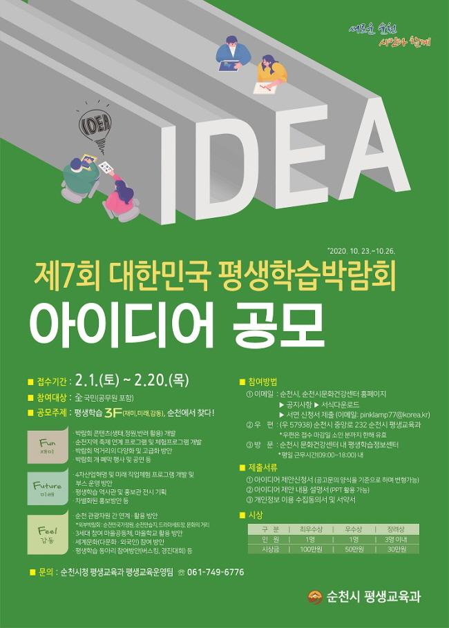 À̹ø ¾ÆÀ̵ð¾î¸¦ °ø¸ðÇÏ´Â ¡®Á¦7ȸ ´ëÇѹα¹ Æò»ýÇнÀ¹Ú¶÷ȸ¡¯´Â ±³À°ºÎ ÁÖ°üÀ¸·Î Àü¶ó³²µµ, Àü³²±³À°Ã»,¼øÃµ½Ã °øµ¿ ÁÖÃÖ·Î 10¿ù 23ÀϺÎÅÍ 26ÀϱîÁö 4Àϰ£ ¼øÃµ¸¸»ýŹ®È±³À°¿ø ÀÏ¿ø¿¡¼ °³ÃÖµÉ ¿¹Á¤ÀÌ´Ù.