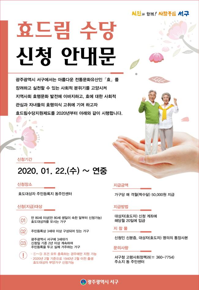 À̹ø Áö¿ø»ç¾÷À» À§ÇØ ¼±¸´Â Áö³ÇØ 12¿ù¡¸±¤ÁÖ±¤¿ª½Ã ¼±¸ È¿ÇàÀå·Á ¹× Áö¿ø¿¡ °üÇÑ Á¶·Ê¡¹¸¦ °³Á¤¡¤°øÆ÷Çß´Ù. ½Åû´ë»óÀº ¸¸ 80¼¼ ÀÌ»óÀÎ È¿µµ´ë»óÀÚ¸¦ ¸ð½Ã´Â 3¼¼´ë ÀÌ»ó ±¸¼º °¡±¸·Î ¼±¸¿¡¼ 2³â ÀÌ»ó Áֹεî·ÏÀ» µÎ°í ½ÇÁ¦°ÅÁÖ Çϰí ÀÖ¾î¾ß ÇÑ´Ù. ½ÅûÀº ÁÖ¼ÒÁö µ¿ ÇàÁ¤º¹Áö¼¾ÅÍ¿¡¼ Áö±Þ½Åû¼¸¦ ÀÛ¼º, °ü·ÃÀڷḦ ÷ºÎÇØ Á¦ÃâÇÏ¸é µÇ¸ç ÃÖ´ë ¿¬ 30¸¸¿øÀÇ Çö±ÝÀ» Áö±ÞÇÒ ¿¹Á¤ÀÌ´Ù.
