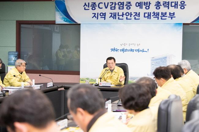 [È£³²´º½º¶óÀÎ = ¼ÀºÈ« ±âÀÚ] ±¤ÁÖ±¤¿ª½Ã´Â 8ÀÏ ½Ãû Àç³»óȲ½Ç¿¡¼ À̿뼷 ½ÃÀå ÁÖÀç·Î ±¤Áֽà ½Ç¡¤±¹Àå, 5°³ ÀÚÄ¡±¸ µîÀÌ Âü¼®ÇÑ ¡®±ä±Þ »óȲÁ¡°Ë ȸÀÇ¡¯¸¦ °³ÃÖÇÏ°í °¢ ½Ç¡¤±¹º° ½ÅÁ¾ Äڷγª¹ÙÀÌ·¯½º °¨¿°Áõ ´ëÀÀ ÃßÁø»óȲ°ú Á¶Ä¡°èȹ µîÀ» Á¡°ËÇß´Ù.