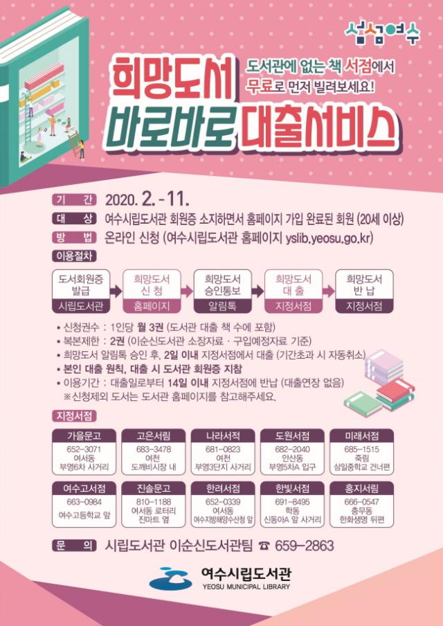 ÀÐ°í ½ÍÀº Ã¥ÀÌ À̼ø½Åµµ¼°ü¿¡ ¾ø´Â °æ¿ì ¿©¼ö½Ã¸³µµ¼°ü ȨÆäÀÌÁö(yslib.yeosu.go.kr)¿¡ Á¢¼ÓÇÏ¿© Èñ¸Áµµ¼¸¦ ½ÅûÇϸé ÁöÁ¤ÇÑ ¼Á¡¿¡¼ ¹Ù·Î Ã¥À» ºô·Áº¼ ¼ö ÀÖ´Ù.