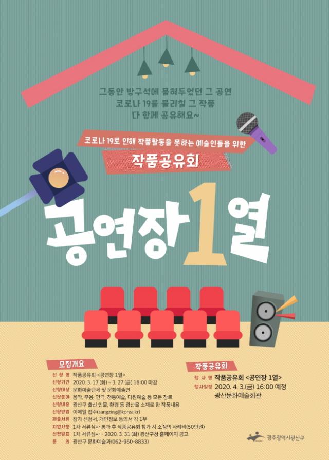 ±¤»ê±¸(±¸Ã»Àå ±è»ïÈ£)°¡ Äڷγª19·Î °ø¿¬ Ȱµ¿ÀÌ Áß´ÜµÈ ¿¹¼úÀεéÀ» ÀÀ¿øÇÏ´Â ÀÛǰ(±âȹ) °øÀ¯È¸ ¡®°ø¿¬Àå1¿¡¯ Çà»ç¸¦ ´ÙÀ½´Þ 3ÀÏ ±¤»ê¹®¿¹È¸°ü¿¡¼ °³ÃÖÇϱâ·Î Çϰí, ÀÌ´Þ 27ÀϱîÁö Âü¿© ¿¹¼úÀΡ¤´Üü¸¦ ¸ðÁýÇÑ´Ù.