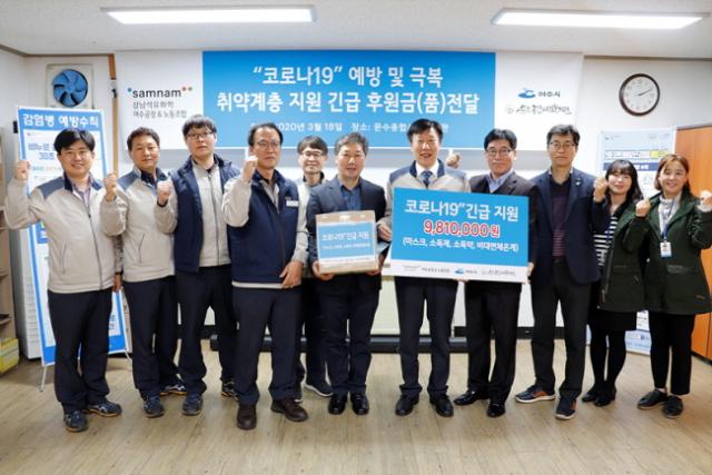 [È£³²´º½º¶óÀÎ = ¼ÀºÈ« ±âÀÚ] »ï³²¼®À¯ÈÇÐ(ÁÖ) ¿©¼ö°øÀå(°øÀåÀå ÀÌ¿À½Ä)Àº Áö³ 18ÀÏ ¹®¼öÁ¾ÇÕ»çȸº¹Áö°ü¿¡¼ Äڷγª19·Î »ýȰÀÇ ¾î·Á¿òÀ» °Þ°í ÀÖ´Â Àú¼Òµæ Ãë¾à°èÃþÀ» Áö¿øÇϰíÀÚ ÈÄ¿ø±Ý 981¸¸ ¿øÀ» ¸¶·ÃÇØ ¿©¼ö½Ã¿¡ Àü´ÞÇß´Ù.
