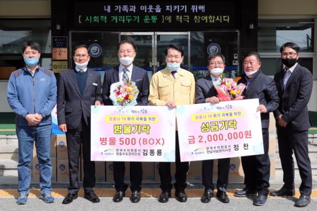 [È£³²´º½º¶óÀÎ = ¼ÀºÈ« ±âÀÚ] K-water Àü³²¼³²±ÇÁö»çÀå Á¤Âù°ú ÀåÈï¼öµµ°ü¸®´ÜÀå ±èµ¿·æÀº ¡®Äڷγª19¡¯·Î °íÅëÀ» ¹Þ°í ÀÖ´Â ÀÌ¿ô¿¡°Ô ÈûÀ» º¸ÅÂ°í ½Í´Ù¸ç 31ÀÏ ÀåÈﱺ¿¡ ¼º±Ý 200¸¸¿ø°ú º´¹° 500box¸¦ °¢°¢ ±âŹÇß´Ù.