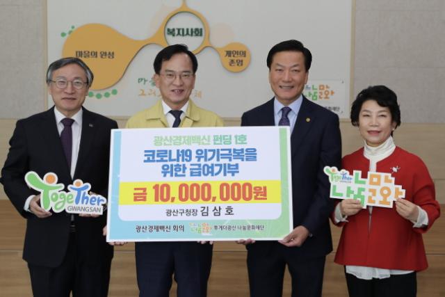 [È£³²´º½º¶óÀÎ = ¼ÀºÈ« ±âÀÚ] ±è»ïÈ£ ±¤ÁÖ ±¤»ê±¸Ã»ÀåÀÌ, 9ÀÏ Åõ°Ô´õ±¤»ê³ª´®¹®ÈÀç´Ü¿¡¼ Äڷγª19 »çÅ·Π¾î·Á¿òÀ» °Þ°í ÀÖ´Â Áß¼Ò±â¾÷°ú ¼Ò»ó°øÀÎÀ» µ½´Â¡®±¤»ê°æÁ¦¹é½Å ÆÝµù¡¯¿¡ 1,000¸¸¿øÀ» ±âŹÇϱâ·Î ¾à¼ÓÇß´Ù. À̳¯ ±è ûÀåÀÇ ³ª´®Àº, ¡®±¤»ê°æÁ¦¹é½ÅȸÀÇ¡¯ÀÇ Ã¹ »ç¾÷ÀÎ ÆÝµù ¸ð±ÝÀ» ¼±µµÇÏ´Â ÇຸÀÌ´Ù.