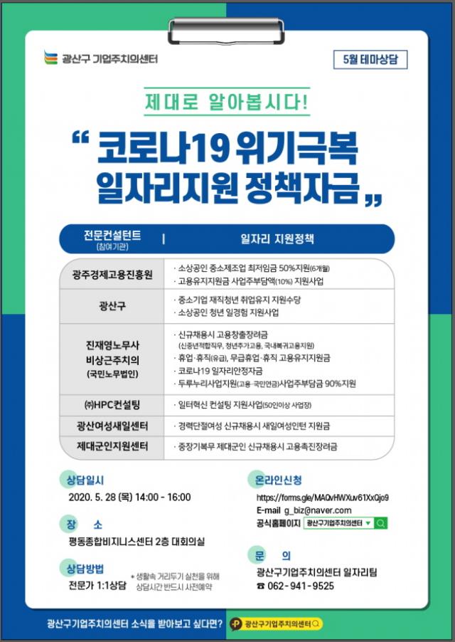 ÇÑÆí, »ó´ã¿¡´Â ±¤»ê±¸±â¾÷ÁÖÄ¡ÀǼ¾ÅÍ, ±¤ÁÖ°æÁ¦°í¿ëÁøÈï¿ø, ±¹¹Î³ë¹«¹ýÀÎ ÁøÀ翵 ³ë¹«»ç, ¢ßHPC ÄÁ¼³ÆÃ, ±¤»ê¿©¼º»õÀϼ¾ÅÍ, Á¦´ë±ºÀÎÁö¿ø¼¾ÅÍ µîÀÌ Âü°¡Çϸç, »ó´ãÀ» ¿øÇÏ´Â ±â¾÷Àº ¿Â¶óÀÎÀ¸·Î »ó´ã½Ã°£À» »çÀü ¿¹¾àÇÏ¸é µÈ´Ù.