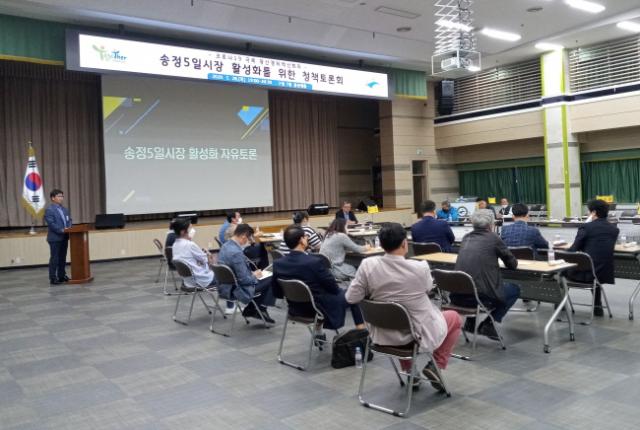½ÃÀå»óÀΰú ÁֹΠµî 40¿©¸íÀÌ Âü¿©ÇÑ °¡¿îµ¥ ÁøÇàµÈ Åä·Ðȸ´Â, ¼ÛÁ¤5ÀϽÃÀåÀÇ ¹Ì·¡ Àü¸Á, Ÿ ½ÃÀå »ç·Ê °øÀ¯, 5ÀϽÃÀåÀÇ ¹®Á¦Á¡°ú °³¼±¾È¿¡ ´ëÇÑ ÀÚÀ¯ÀÇ°ß Á¦½Ã ¼øÀ¸·Î À̾îÁ³´Ù.