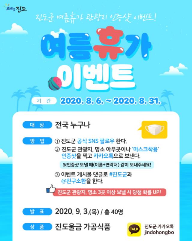 ¡®Áøµµ±º ¿©¸§ ÈÞ°¡ °ü±¤Áö ÀÎÁõ¼¦ À̺¥Æ®¡¯´Â ¿À´Â 8¿ù 31ÀϱîÁö ÁøµµÅ¸¿ö, ¿î¸²»ê¹æ, Áøµµ°³Å׸¶ÆÄÅ©, ¼¼¹æ³«Á¶ µî ÁÖ¿ä °ü±¤Áö¸¦ ¸¶½ºÅ©¸¦ ¾²°í ¹æ¹®ÇÏ¿© ÀÎÁõ¼¦À» ÃÔ¿µ ÈÄ Áøµµ±º īī¿ÀÅå ID°Ë»öÇÏ¿© ÀÎÁõ¼¦À» Àü¼ÛÇÏ¸é µÈ´Ù.