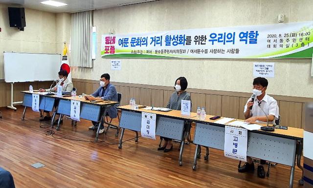 [È£³²´º½º¶óÀÎ = ¼ÀºÈ« ±âÀÚ] ¿©¼ö½Ã ¿©¼, ¹®¼öµ¿ÀÇ ÁÖ¹ÎÀÚÄ¡À§¿øÀå°ú ÁֹδëÇ¥ µîÀ¸·Î ±¸¼ºµÈ ¿©¼‧¹®¼ö¸¦ »ç¶ûÇÏ´Â »ç¶÷µéÀÌ Áö³ 25ÀÏ ¿©¼µ¿ Áֹμ¾ÅÍ ´ëȸÀǽǿ¡¼ ¡®¿©¹® ¹®ÈÀÇ °Å¸® Ȱ¼ºÈ¸¦ À§ÇÑ ¿ì¸®ÀÇ ¿ªÇÒ¡¯À̶ó´Â ÁÖÁ¦·Î Æ÷·³À» °³ÃÖÇß´Ù°í 27ÀÏ ¹àÇû´Ù.