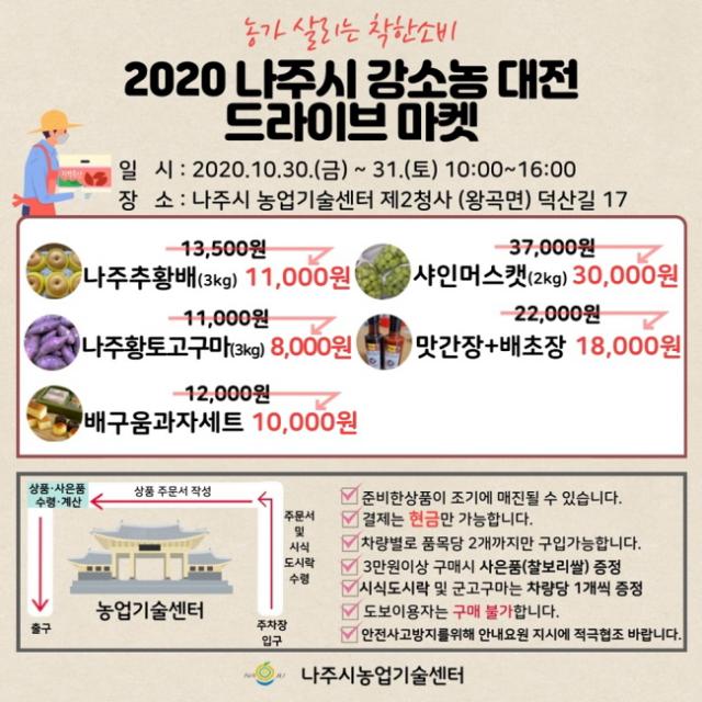 ³ªÁÖ½Ã(½ÃÀå °ÀαÔ)´Â ¿À´Â 30ÀϺÎÅÍ 31ÀϱîÁö ¾çÀÏ °£ 10½ÃºÎÅÍ 16½Ã±îÁö ³ó¾÷±â¼ú¼¾ÅÍ ÁÖÂ÷Àå¿¡¼ Áö¿ª ³ó»ê¹° ÆÇ¸Å Ȱ¼ºÈ¸¦ À§ÇÑ ¡®µå¶óÀÌºê ¸¶ÄÏ¡¯À» ¿î¿µÇÑ´Ù°í 27ÀÏ ¹àÇû´Ù.