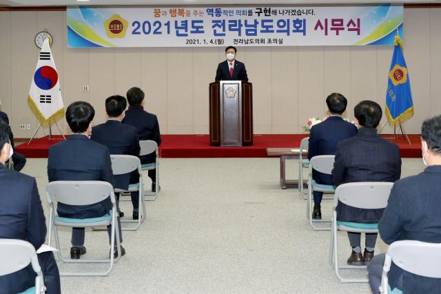 [È£³²´º½º¶óÀÎ = ¼ÀºÈ« ±âÀÚ] Àü¶ó³²µµÀÇȸ(ÀÇÀå ±èÇÑÁ¾)´Â 4ÀÏ µµÀÇȸ ÃÊÀǽǿ¡¼ 2021³â ½Ã¹«½ÄÀ» °®°í, 2020³â ÀÇÁ¤È°µ¿ ¼º°ú¸¦ °øÀ¯ÇÏ°í ¿Ã ÇÑÇØ µµ¹ÎµéÀ» À§ÇÑ ÀÇȸ¿î¿µÀ» ´ÙÁüÇß´Ù.