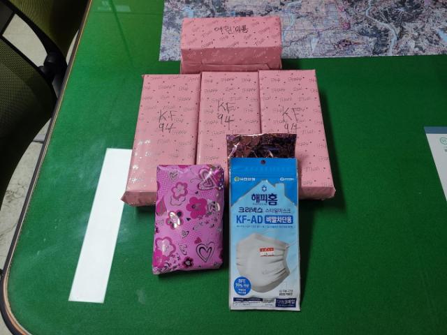 ¼Ò³à°¡ °Ç³Ù ¼±¹°Àº ÃÑ 6°³. ºÐÈ«»ö Æ÷ÀåÁö¿¡ ½×ÀÎ 4°³ ¼±¹°¿¡´Â ¡®¾î¸°À̿롯 ¡®KF94¡¯¶ó´Â ²Ú²Ú ´·¯¾´ »çÀÎÆæ ±Û¾¾°¡ ¹ÚÇôÀÖ¾ú´Ù. ³ª¸ÓÁö µÎ ¼±¹° Æ÷Àå¿¡¼µµ ¼Ò³àÀÇ Á¤¼ºÀº °í½º¶õÈ÷ ¹¯¾î³µ´Ù. ¼±¹°µé ¼Ó¿¡´Â ÃÑ 50°³ÀÇ ¹æ¿ª¸¶½ºÅ©°¡ µé¾îÀÖ¾ú´Ù.