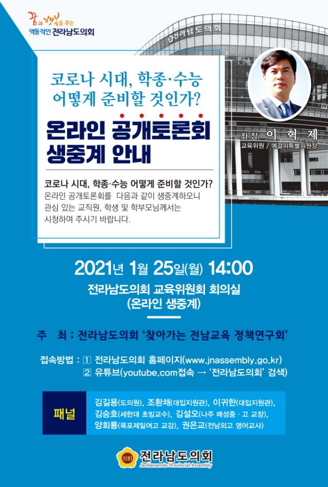 [È£³²´º½º¶óÀÎ = ¼ÀºÈ« ±âÀÚ] Àü³²µµÀÇȸ ¡®Ã£¾Æ°¡´Â Àü³²±³À° Á¤Ã¥¿¬±¸È¸¡¯(´ëÇ¥ÀÇ¿ø ÀÌÇõÁ¦)´Â 25ÀÏ µµÀÇȸ ±³À°À§¿øÈ¸ ȸÀǽǿ¡¼ ¡®Äڷγª ½Ã´ë, ÇлýºÎÁ¾ÇÕÀüÇü․¼öÇдɷ½ÃÇè ¾î¶»°Ô ´ëºñÇÒ °ÍÀΰ¡?¡¯¶ó´Â ÁÖÁ¦·Î ¿Â¶óÀÎ °ø°³Åä·Ðȸ¸¦ °³ÃÖÇÑ´Ù.