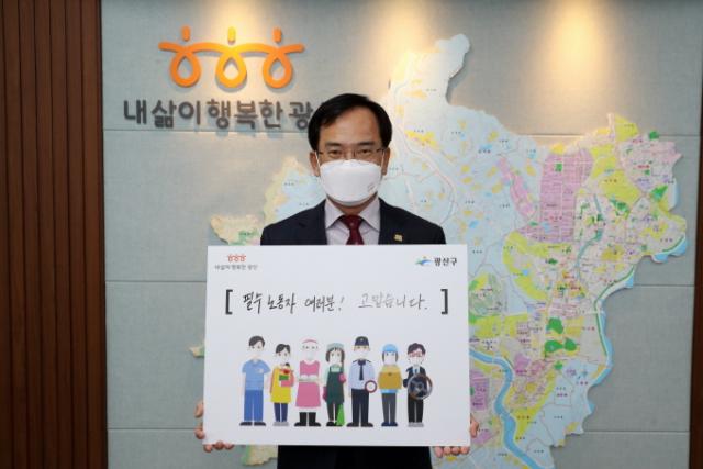 [È£³²´º½º¶óÀÎ = ¼ÀºÈ« ±âÀÚ] ±è»ïÈ£ ±¤»ê±¸Ã»ÀåÀÌ Äڷγª19 »óȲ ¼Ó ´ë¸é ¾÷¹«¸¦ À̾°í ÀÖ´Â Çʼö³ëµ¿ÀÚµéÀ» ÀÀ¿øÇÏ´Â ¡®°í¸¿½À´Ï´Ù. Çʼö³ëµ¿ÀÚ¡¯ Ä·ÆäÀο¡ Âü¿©Çß´Ù.