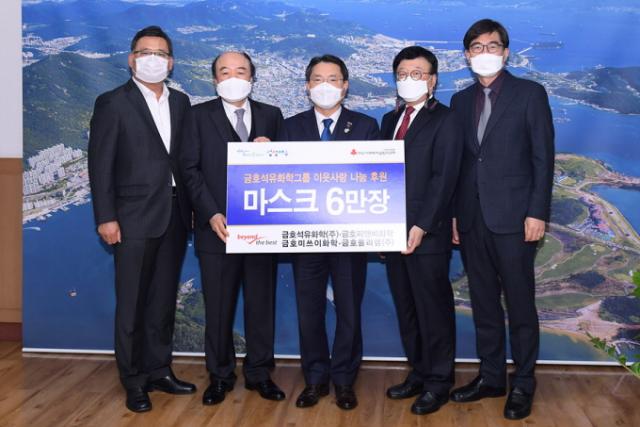 Áö³ 19ÀÏ ±ÝÈ£¼®À¯ÈÇÐ(ÁÖ) ¼Û¼®±Ù ºÎ»çÀåÀ» ºñ·ÔÇØ ±ÝÈ£ÇǾغñÈÇÐ Á¤¿µÈ£ Àü¹«, ±ÝÈ£¹Ì¾²ÀÌÈÇÐ ¼Õ¿µ¿ø ºÎ»çÀå, ±ÝÈ£Æú¸®ÄÍ(ÁÖ) ÃÖ¿µ¼± °øÀåÀåÀÌ ¿©¼ö½Ãû ½ÃÀå½ÇÀ» ã¾Æ ±Ç¿ÀºÀ ¿©¼ö½ÃÀå¿¡°Ô Äڷγª19 ±Øº¹À» À§ÇÑ KF94 ¸¶½ºÅ© 6¸¸ÀåÀ» ÈÄ¿øÇÏ´Â Àü´Þ½ÄÀ» °¡Á³´Ù.