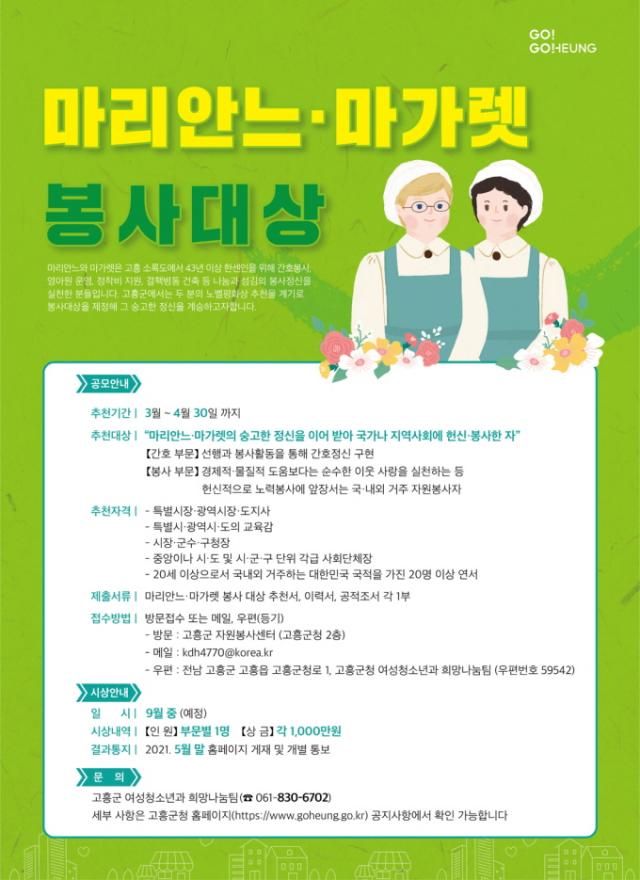 [È£³²´º½º¶óÀÎ = ¼ÀºÈ« ±âÀÚ] °íÈﱺ(±º¼ö ¼Û±Í±Ù)Àº ¸¶¸®¾È´À¿Í ¸¶°¡·¿ µÎ ºÐ °£È£»çÀÇ ³ëº§ ÆòÈ»ó ÃßõÀ» °è±â·Î ¡®¸¶¸®¾È´À¡¤¸¶°¡·¿ ºÀ»ç´ë»ó¡¯À» Á¦Á¤Çϰí, ¿À´Â 4¿ù 30ÀÏ ±îÁö Èĺ¸ÀÚ¸¦ Ãßõ °ø¸ðÇÑ´Ù.