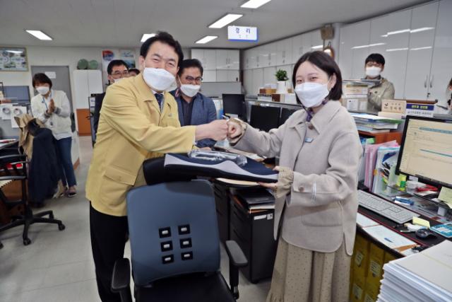 ÀåÈﱺÀº Á÷Àå ³» Àӽš¤Ãâ»ý ºÐÀ§±â¸¦ Àå·ÁÇϰíÀÚ ¿À·£ ½Ã°£ ÄÄÇ»ÅÍ ¾Õ¿¡ ¾É¾Æ ÀÖ´Â ÀÓ½ÅÇÑ Á÷¿øµéÀ» À§ÇØ ÆíÀǹ°Ç°À» Àü´ÞÇß´Ù.