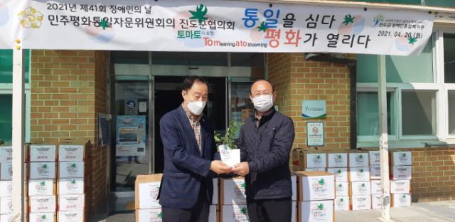 Á¦41ȸ Àå¾ÖÀÎÀÇ ³¯À» ¸Â¾Æ ¹ÎÁÖÆòÈÅëÀÏÀÚ¹®À§¿øÈ¸ÀÇ Áøµµ±ºÇùÀÇȸ°¡ Á¤¼Áö¿ø »ç¾÷ÀÇ ÀÏȯÀ¸·Î ÆòÅëÀ§¿øµéÀÇ ¼º±Ý 100¿©¸¸¿øÀ¸·Î ¡®Çູ Å丶Åä ¸ðÁ¾¡¯À» ±¸ÀÔ, Àå¾ÖÀεéÀÌ °¡Á¤¿¡¼ Ű¿ï ¼ö ÀÖ´Â Å丶Åä ¸ðÁ¾À» Àü´ÞÇß´Ù.