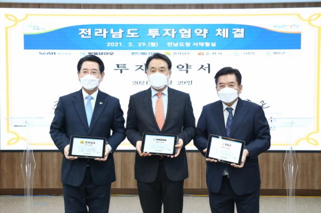Áö³ 3¿ù 29ÀÏ Àü³²µµÃ» ¼ÀçÇʽǿ¡¼ Àü¶ó³²µµ(µµÁö»ç ±è¿µ·Ï), ¢ß¹Ú¼¿¹ÙÀÌ¿À(°øµ¿´ëÇ¥ ÀÌÁØÇà)¿Í 300¾ï ±Ô¸ðÀÇ ÅõÀÚ¾çÇØ°¢¼(MOU)¸¦ ü°áÇß´Ù. ±è¿µ·Ï Áö»ç(¿ÞÂʺÎÅÍ), ÀÌÁØÇà ´ëÇ¥, ±¸Ãæ°ï ȼø±º¼ö°¡ ü°á½Ä¿¡¼ ±â³ä ÃÔ¿µÀ» Çϰí ÀÖ´Ù.