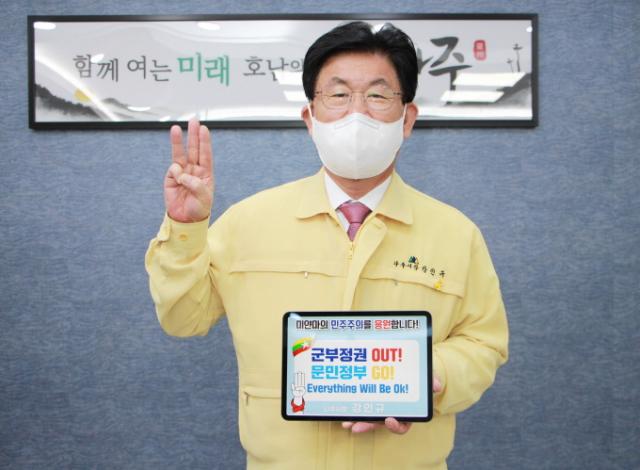 ÇÑÆí, °ÀÎ±Ô ³ªÁÖ½ÃÀåÀº ¡°±º»çÁ¤±Ç¿¡ ¸Â¼ ¹ÎÁÖÁÖÀǸ¦ ÁöÄѿ ´ëÇѹα¹ÀÇ ±¹¹Î ÇÑ »ç¶÷À¸·Î¼ ¹Ì¾á¸¶ ±ººÎ¸¦ ±ÔźÇÏ°í ¹Ì¾á¸¶ ±¹¹ÎÀÇ ¹ÎÁÖÁÖÀÇ ¼öÈ£ÀÇ ¿¸ÁÀ» ÀÀ¿øÇÑ´Ù¡±¸ç ¡°ÇϷ绡¸® ¹ÎÁÖÁÖÀÇÀÇ ½Â¸®¸¦ ÅëÇØ µû¶æÇÏ°í ÆòÈ·Î¿î ¹Ì¾á¸¶ÀÇ º½ÀÌ Ã£¾Æ¿À±â¸¦ ±â¿øÇÑ´Ù¡±°í ¸»Çß´Ù.