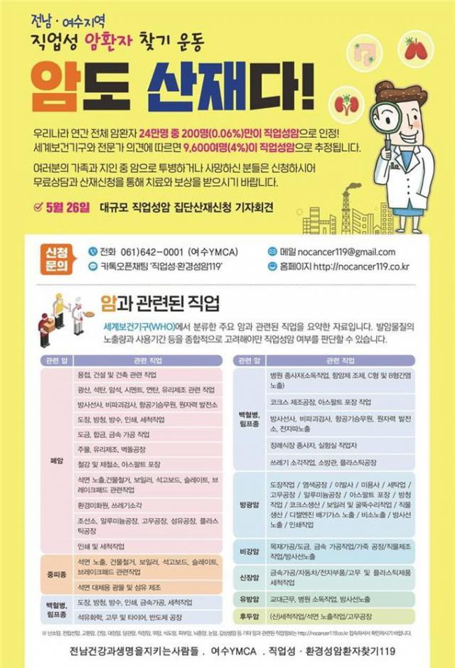 [È£³²´º½º¶óÀÎ = ¼ÀºÈ« ±âÀÚ] ¿©¼öYMCA, Àü³²°Ç°°ú»ý¸íÀ»Áö۴»ç¶÷µé(ÀÌÇÏ Àü³²°Ç»ýÁö»ç), Á÷¾÷¼º.ȯ°æ¼º ¾ÏȯÀÚ Ã£±â 119(ÀÌÇÏ Á÷¾÷¼º¾Ï119)´Â Àü³²µ¿ºÎÁö¿ª¿¡¼ Á÷¾÷±Ù¹«»ó ¹ß¾Ï¹°Áú Ãë±Þ»ç¾÷Àå¿¡¼ Àå±â°£ ±Ù¹«¸¦ ÇÏ°í ¾ÏÀ¸·Î »ç¸ÁÇϰųª, ¾Ï ÆÇÁ¤À» ¹ÞÀº »ç¶÷µéÀ» ´ë»óÀ¸·Î Á÷¾÷¼º, ȯ°æ¼º ¿äÀο¡ ÀÇÇÑ ¾ÏȯÀÚ¸¦ ã¾Æ »ê¾÷ÀçÇØ ½Åû°ú ÆÇ°áÀ» Áö¿øÇÏ¿© ³ëµ¿ÀÚÀÇ °Ç°±Ç°ú »ý¸í±ÇÀ» ÁöÄѳª°¡´Â ¿îµ¿À» Àü°³Çϰí ÀÖ´Ù.