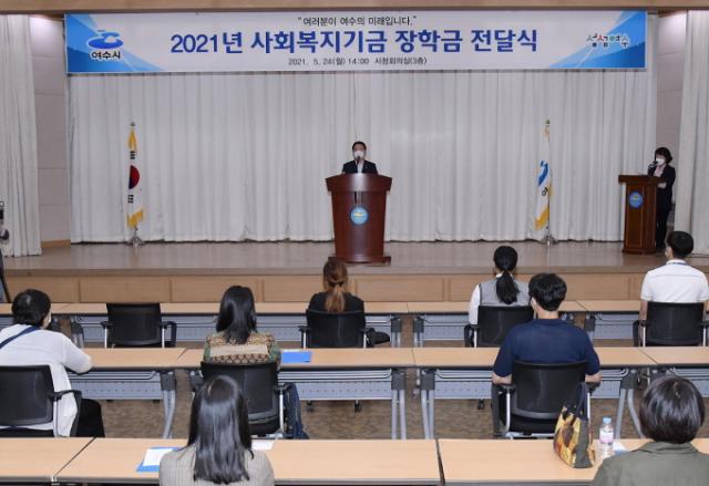 ½Ã¿¡ µû¸£¸é Áö³ 24ÀÏ ½Ãû ȸÀǽǿ¡¼ 2021³â ¿©¼ö½Ã »çȸº¹Áö±â±Ý ÀåÇÐ±Ý Àü´Þ½ÄÀÌ Äڷγª19·Î Ãà¼Ò °³ÃֵƴÙ. À̳¯ ±Ç¿ÀºÀ ¿©¼ö½ÃÀåÀº 30¸íÀÇ Çлýµé¿¡°Ô ÀåÇбÝÀ» Áö±ÞÇÏ¸ç °Ý·Á¿¡ ³ª¼¹´Ù.
