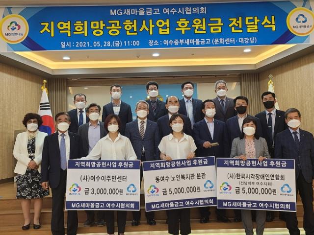 ¿©¼ö½Ã¿¡ µû¸£¸é 28ÀÏ ¿ÀÀü ¿©¼öÁߺλõ¸¶À»±Ý°í ´ë°´ç¿¡¼ Áö¿ª 13°³ »õ¸¶À»±Ý°í ÀÌ»çÀå°ú Áß¾Óȸ ¾È¼¼Âù ÀÌ»ç, ¿©¼ö½Ã °ü°èÀÚ, ¼öÇý´Üü°¡ Âü¼®ÇÑ °¡¿îµ¥ ¡®2021³â Áö¿ªÈñ¸Á°øÇå»ç¾÷¡¯ ÈÄ¿ø±Ý Àü´Þ½ÄÀÌ ¿·È´Ù.