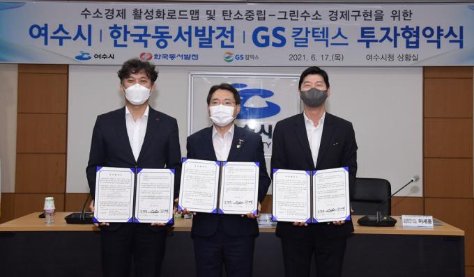 17ÀÏ ¿©¼ö½Ãû »óȲ½Ç¿¡¼ ±Ç¿ÀºÀ ¿©¼ö½ÃÀå(°¡¿îµ¥), ±è¿µ¹® Çѱ¹µ¿¼¹ßÀü »çÀå(¿ÞÂÊ), Ç㼼ȫ GSĮŨ½º »çÀå(¿À¸¥ÂÊ)ÀÌ ¡®¼ö¼Ò°æÁ¦È°¼ºÈ ¹× ź¼Ò Á߸³À» À§ÇÑ ÅõÀÚÇù¾à¡¯À» ü°áÇÑ ÈÄ ±â³äÃÔ¿µÀ» Çϰí ÀÖ´Ù.