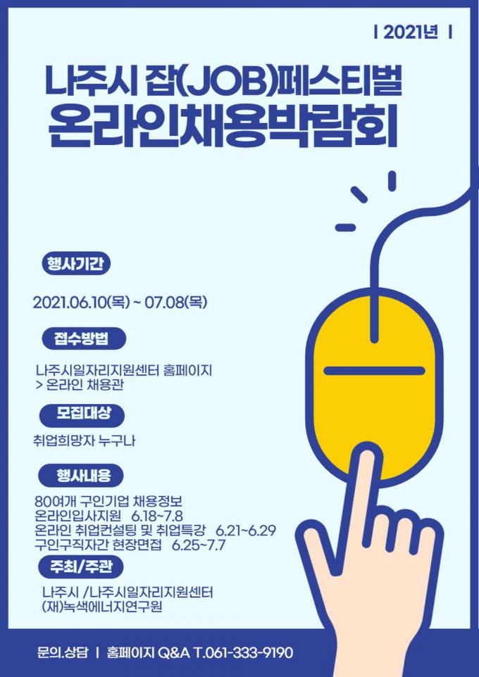 ³ªÁÖ½Ã(½ÃÀå °ÀαÔ)´Â Áö³ 18ÀϺÎÅÍ 7¿ù 8ÀϱîÁö 3ÁÖ °£ ÀÏÀÚ¸®Áö¿ø¼¾ÅÍ ´©¸®Áý¿¡¼ ¡®2021³â Àâ(JOB) Æä½ºÆ¼¹ú¡¯, ¡®¿Â¶óÀΠä¿ë¹Ú¶÷ȸ¡¯¸¦ °³ÃÖ ÁßÀ̶ó°í 23ÀÏ ¹àÇû´Ù.