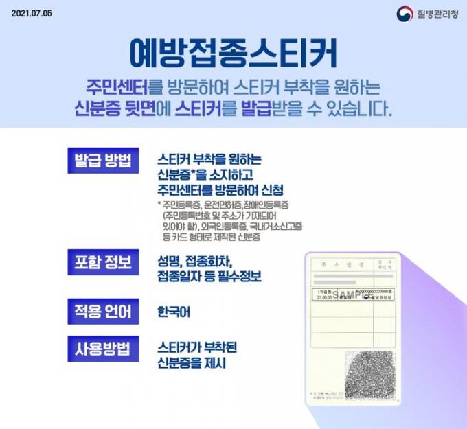 ¿¹¹æ Á¢Á¾ ¿Ï·áÀÚ´Â ½º¸¶Æ®Æù ¾ÖÇø®ÄÉÀÌ¼Ç ¶Ç´Â Á¾ÀÌ·Î µÈ ¿¹¹æÁ¢Á¾Áõ¸í¼, À¾‧¸é ÇàÁ¤º¹Áö¼¾ÅÍ¿¡¼ Ãâ·ÂÇÑ ½ºÆ¼Ä¿¸¦ ¹ß±Þ¹Þ¾Æ ¿¹¹æÁ¢Á¾À» Áõ¸íÇÒ ¼ö ÀÖ´Ù.