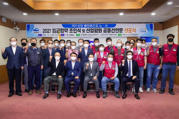 [È£³²´º½º¶óÀÎ = ¼ÀºÈ« ±âÀÚ] ¿©¼öÁö¿ª Ç÷£Æ®°Ç¼³ ³ë»ç°¡ ¿ÃÇØ ÀÓ±ÝÇù¾àÀ» Ÿ°áÇϰí, 2ÀÏ Á¶Àνİú ÇÔ²² »ê¾÷ÆòÈ Á¤ÂøÀ» À§ÇÑ °øµ¿¼±¾ð¹®À» ¼±Æ÷Çß´Ù.
