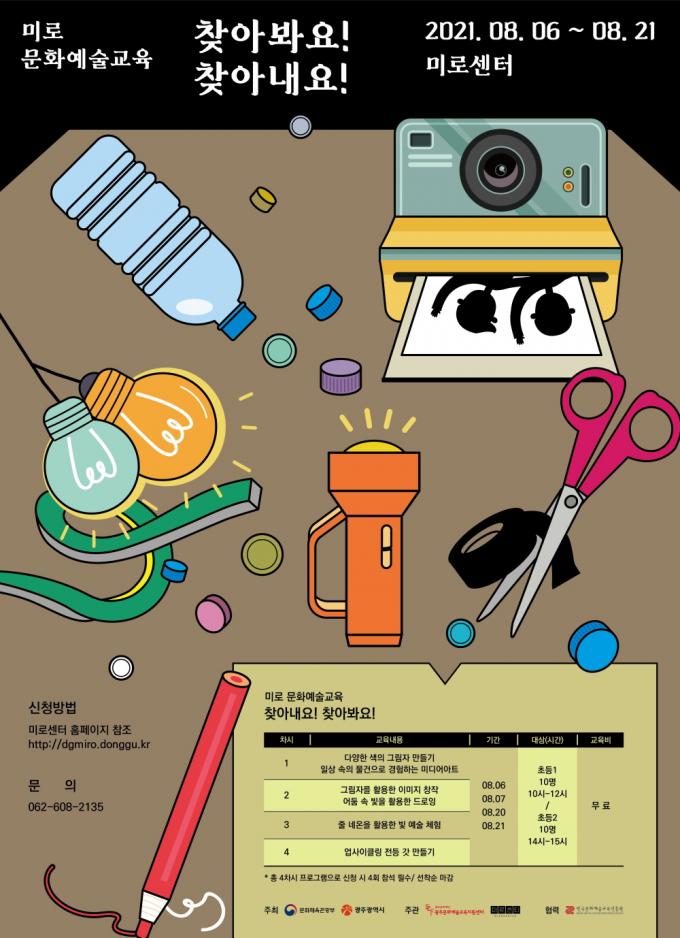 ¹®ÈüÀ°°ü±¤ºÎ‧±¤ÁÖ±¤¿ª½Ã°¡ ÁÖÃÖÇÏ°í ±¤ÁÖ¹®È¿¹¼ú±³À°Áö¿ø¼¾ÅÍ‧±¤ÁÖ±¤¿ª½Ãµ¿±¸(¹Ì·Î¼¾ÅÍ) ÁÖ°ü, Çѱ¹¹®È¿¹¼ú±³À°ÁøÈï¿ø Çù·ÂÀ¸·Î ÁøÇàµÇ´Â ¡®Ã£¾ÆºÁ¿ä! ã¾Æ³»¿ä!¡¯´Â ÀÏ»ó ¼Ó ¼ÒÀ縦 Ȱ¿ëÇÑ Ã¢Á¶Àû ¿¹¼ú Ȱµ¿°æÇèÀ» Áß½ÉÀ¸·Î ÁøÇàµÈ´Ù.