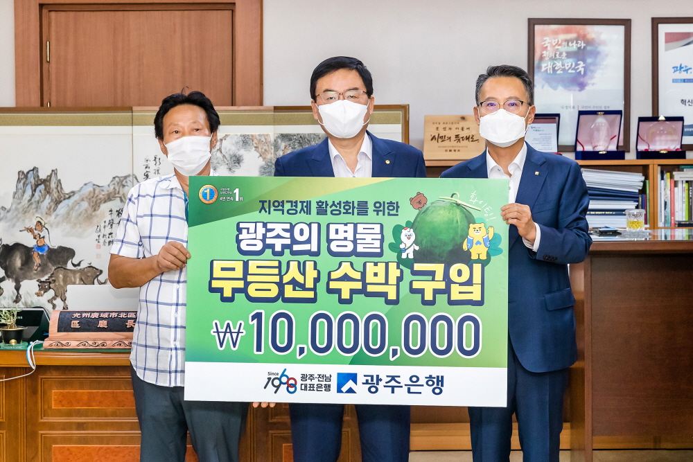- ±¤ÁÖÀºÇà ¼ÛÁ¾¿í ÀºÇàÀå(»çÁø ¿À¸¥ÂÊ)ÀÌ ±¤ÁÖ ºÏ±¸Ã»¿¡¼ ±¤ÁÖÀÇ ¸í¹°ÀÎ ¹«µî»ê ¼ö¹Ú 1õ¸¸¿ø ±¸ÀÔÀ» ÅëÇØ, Áö¿ª »ó»ý¹ßÀüÀÇ ¶æÀ» ¸ðÀ¸°í ÀÖ´Ù.