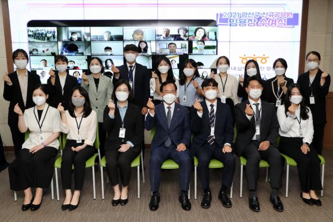 ±¤»ê±¸´Â À̳¯ 2Ãþ »óȲ½Ç¿¡¼ ¡®ÁÜ(Zoom)¡¯À» Ȱ¿ëÇØ 2021 ½Å±Ô °ø¹«¿ø 64¸í¿¡ ´ëÇÑ ÀÓ¿ëÀå ¼ö¿©½Ä °â ¿ÂÅÃÆ® ȯ¿µÈ¸¸¦ ÁøÇàÇß´Ù.