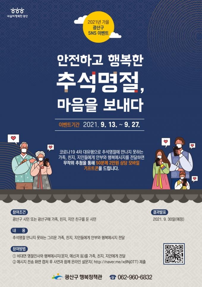 ¡®¾ÈÀüÇϰí ÇູÇÑ Ãß¼®¸íÀý, ¸¶À½À» º¸³»´Ù¡¯¸¦ ÁÖÁ¦·Î ÇÑ À̹ø À̺¥Æ®´Â 27ÀϱîÁö ±¤»ê±¸ °ø½Ä SNS(ºí·Î±×, īī¿À½ºÅ丮, ÆäÀ̽ººÏ µî)¿¡¼ Âü¿©ÇÒ ¼ö ÀÖ´Ù. °¡Á·, Ä£Áö, ÁöÀο¡°Ô ÀüÇÑ ¸íÀýÀλç¿Í Çູ¸Þ½ÃÁö(¹®ÀÚ, ¸Þ½ÅÀú µî) ÀÎÁõ ȸéÀ» ¸µÅ©µÈ Âü¿©ÆäÀÌÁö¿¡ Á¢¼ÓÇÏ¿© »ç¿¬°ú ÇÔ²² ¿Ã¸®¸é µÈ´Ù.