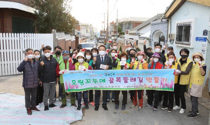 ¸¶À»°øµ¿Ã¼ »ç¾÷ÀÇ ÀÏȯÀ¸·Î ÃßÁøµÈ À̹ø Çà»ç´Â ÁÖ¹ÎÇùÀÇȸ ȸ¿ø, ¸¶À»°øµ¿Ã¼ Ȱµ¿°¡, ÇØ´ç °ñ¸ñ±æ ÁֹΠµî 30¿© ¸íÀÌ Âü¿©ÇÑ °¡¿îµ¥ ÁøÇàµÆÀ¸¸ç ³» Áý ¾Õ ´ë¹®°ú ´ãº¶ô¿¡ ²ÉÀ» ½É°í ³°Àº ´ãÀå¿¡´Â ¸¶À»ÀÇ À̾߱⸦ ´ãÀº º®È¸¦ ±×·Á ¾îµÎ¿î °ñ¸ñ±æÀ» ¹à°í Ä£±ÙÇÑ °ñ¸ñ±æ·Î Å»¹Ù²Þ½ÃÄ×´Ù.