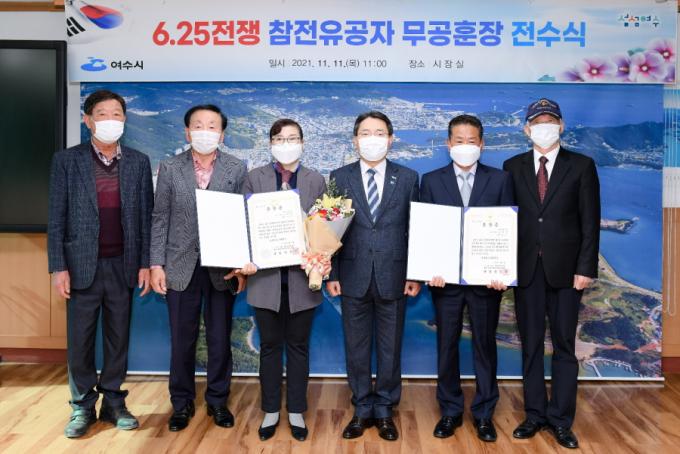 [È£³²´º½º¶óÀÎ = ¼ÀºÈ« ±âÀÚ] ¿©¼ö½Ã´Â Áö³ 11ÀÏ ½ÃÀå Áý¹«½Ç¿¡¼ 6‧25ÀüÀï ÂüÀüÀ¯°øÀÚ Íº±èÃæ¿µ, ͺ±èÇÑ¿µ ÇüÁ¦ÀÇ À¯Á·ÀÎ Á¶Ä« ±è±Ù¿À ¾¾¿¡°Ô ±¹¹æºÎ Àå°üÀ» ´ë½ÅÇØ ȶû ¹«°øÈÆÀåÀ» Àü¼öÇß´Ù°í ¹àÇû´Ù.