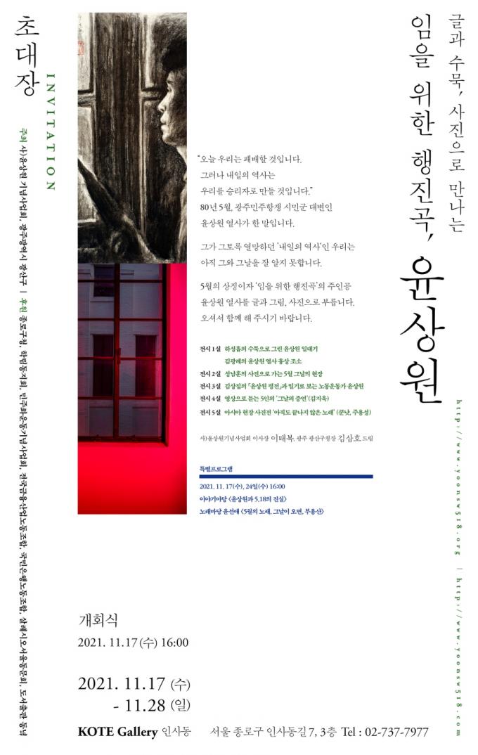Ưº° ÇÁ·Î±×·¥À¸·Î ¡®À±»ó¿ø°ú 5‧18ÀÇ Áø½Ç¡¯À» ÁÖÁ¦·Î ÇÑ À̾߱⸶´çµµ ¸¶·ÃµÈ´Ù.¼¿ï Àü½Ã´Â 28ÀϱîÁö ÁøÇàµÇ¸ç, ÀÌÈÄ¿¡µµ ¼ö¿ø, ÀÎõ µî ´ëµµ½Ã¸¦ ¼øÈ¸Çϸç Àü½Ã°¡ ¿¸± ¿¹Á¤ÀÌ´Ù.