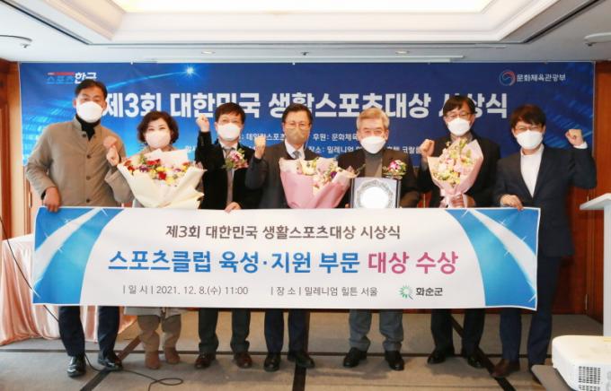 ȼø±ºÀÌ ¡®Á¦3ȸ ´ëÇѹα¹ »ýȰ½ºÆ÷Ã÷´ë»ó¡¯ ½ºÆ÷Ã÷Ŭ·´ À°¼º¡¤Áö¿ø ºÎ¹® ´ë»óÀ» ¼ö»óÇß´Ù. ±¸Ãæ°ï(¿À¸¥ÂÊ 3¹øÂ°) ȼø±º¼ö, ¹Ú»ó°Ç(¿À¸¥ÂÊ 5¹øÂ°) µ¥Àϸ®½ºÆ÷Ã÷ ´ëÇ¥, Á¶Àͼº(¿À¸¥ÂÊ 4¹øÂ°) µ¿¾Æ¿ÀÃ÷Ä« ´ëÇ¥¸¦ ºñ·ÔÇÑ È¼ø±º °ü°èÀÚµéÀÌ ´ë»ó ¼ö»ó ÈÄ ±â³äÃÔ¿µ ÇÏ´Â ¸ð½À