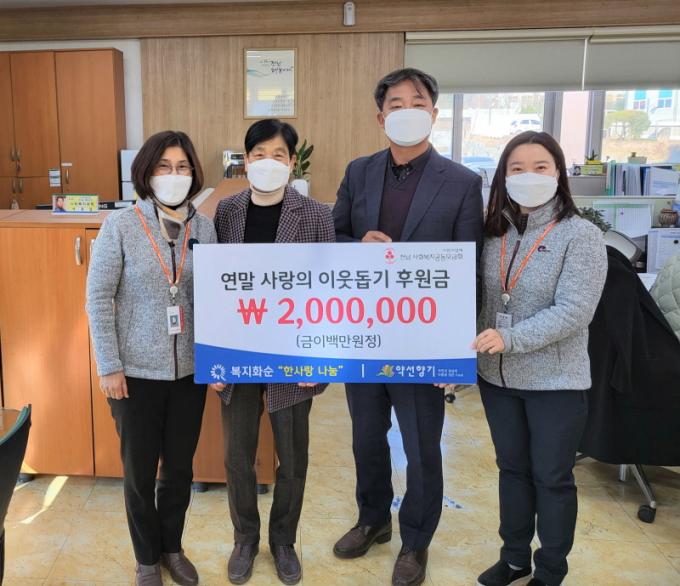 | 13ÀÏ ¾à¼±Çâ±â¿¡¼ ³ªµå¸®³ëÀκ¹Áö°ü¿¡ Çö±Ý 200¸¸ ¿øÀ» ÈÄ¿øÇß´Ù. »çÁøÀº ȼø±º »çȸº¹Áö°ú¿¡¼ ¿¸° ±âŹ½Ä¿¡ Âü¼®ÇÑ ¼ºÀ¼·(¿À¸¥ÂÊ 2¹øÂ°) »çȸº¹Áö°úÀå°ú À̵æÀÚ(¿À¸¥ÂÊ 3¹øÂ°) ¾à¼±Çâ±â ´ëÇ¥, ³ªµå¸®³ëÀκ¹Áö°ü °ü°èÀÚ°¡ ±â³ä ÃÔ¿µÇÏ´Â ¸ð½À |
