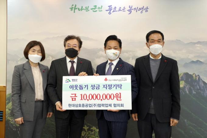 [È£³²´º½º¶óÀÎ = ¼ÀºÈ« ±âÀÚ] Çö´ë»ïÈ£Áß°ø¾÷(ÁÖ)Çù·Â¾÷ü ÇùÀÇȸ(ȸÀå ±è¿ëȯ)¿¡¼´Â Áö³ 14ÀÏ ¿µ¾Ï±º Àú¼ÒµæÃþ¿¡°Ô µµ¿òÀ» ÁÖ±â À§ÇØ ÀÌ¿ôµ½±â ¼º±Ý 1,000¸¸¿øÀ» ±âŹÇÏ¿´´Ù.