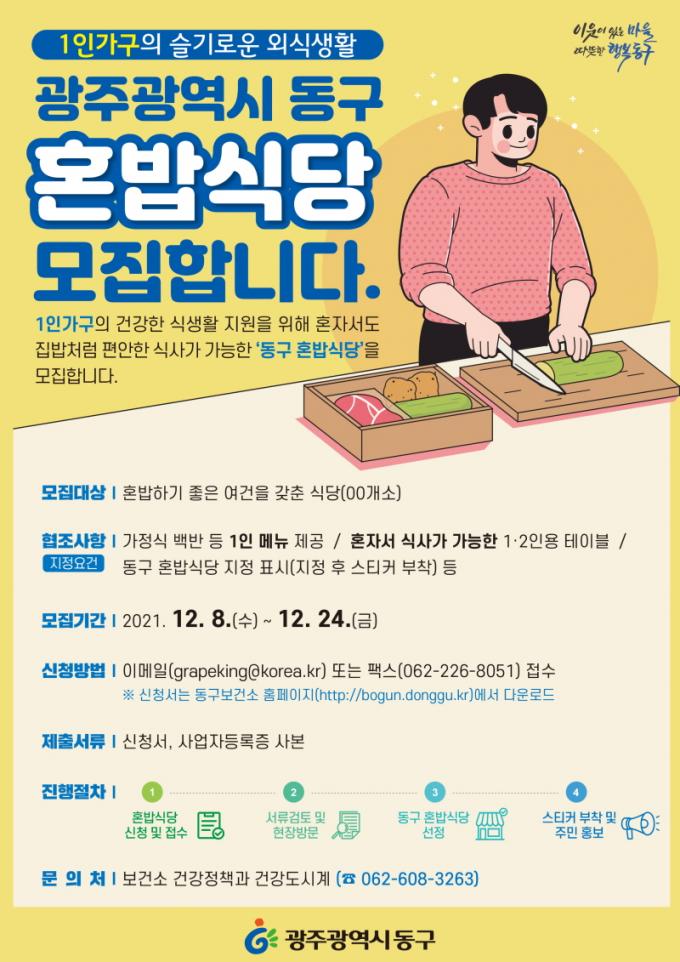 [È£³²´º½º¶óÀÎ = ¼ÀºÈ« ±âÀÚ] ±¤ÁÖ µ¿±¸(ûÀå ÀÓÅÃ)´Â ±ÞÁõÇÏ´Â 1ÀÎ °¡±¸ÀÇ °Ç°ÇÑ ½Ä»ýȰ Áö¿øÀ» À§ÇØ È¥ÀÚ¼µµ Áý¹äó·³ Æí¾ÈÇÑ ½Ä»ç°¡ °¡´ÉÇÑ ¡®µ¿±¸ È¥¹ä½Ä´ç¡¯À» ¸ðÁýÇÑ´Ù°í ¹àÇû´Ù.