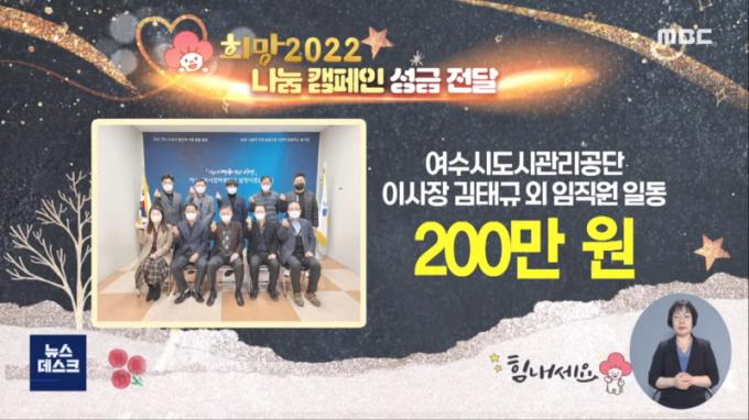 [È£³²´º½º¶óÀÎ = ¼ÀºÈ« ±âÀÚ] ¿©¼ö½Ãµµ½Ã°ü¸®°ø´Ü(ÀÌ»çÀå ±èűÔ)Àº Áö³ 17ÀÏ ¿¬¸»¿¬½Ã ¼Ò¿ÜµÈ ÀÌ¿ô°ú »çȸÀû Ãë¾à°èÃþÀ» À§ÇÑ ºÒ¿ìÀÌ¿ôµ½±â ¼º±Ý 200¸¸¿øÀ» »çȸº¹Áö°øµ¿¸ð±Ýȸ(»ç¶ûÀÇ¿¸Å) ¡°Èñ¸Á2022, ³ª´®Ä·ÆäÀΡ±¿¡ ±âºÎÇÏ¿´´Ù.