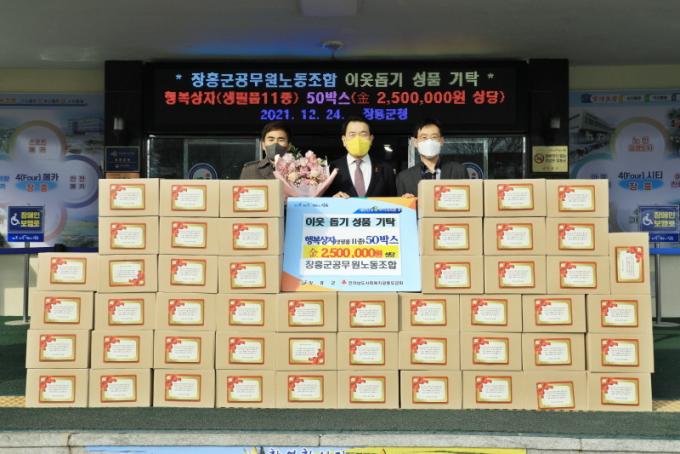 Àü³²µµÃ»°ø¹«¿ø³ëÁ¶´Â ÀåÈﱺÀ» Æ÷ÇÔ 4°³ ÁöÀÚü¸¦ ¼±Á¤, »ýÇÊǰ 11Á¾(Âüġĵ, °í¹«Àå°©, ¼ö¼¼¹Ì, ¹Ùµð¿ö½Ã µî)ÀÌ µé¾î ÀÖ´Â Çູ»óÀÚ 200°³(1õ¸¸ ¿ø »ó´ç)¸¦ ¼ºÅºÀý Àü³¯¿¡ ¼±¹°ÇÏ¿© ÈÆÈÆÇÑ °¨µ¿À» ¾È°Ü ÁÖ¾ú´Ù.