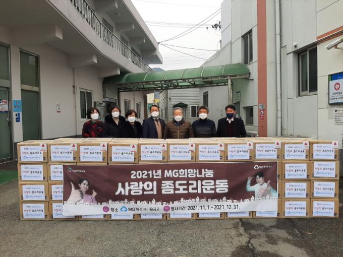 Áö³ 5ÀÏ MGȼø »õ¸¶À»±Ý°í°¡ »ç¶ûÀÇ Á»µµ¸®¿îµ¿À» ÅëÇØ ¸¶·ÃÇÑ ¶ó¸é 110»óÀÚ¸¦ ȼøÀ¾ ÇàÁ¤º¹Áö¼¾ÅÍ¿¡ ±âºÎÇß´Ù. »çÁøÀº ±âŹ½Ä¿¡ Âü¼®ÇÑ ±è»óÁø(¿À¸¥ÂÊ 2¹øÂ°) ȼøÀ¾ ÁÖ¹ÎÁö¿ø°úÀå°ú ±è±ÔÇö(¿À¸¥ÂÊ 3¹øÂ°) MGȼø »õ¸¶À»±Ý°í ºÎÀÌ»çÀåÀ» ºñ·ÔÇÑ È¼øÀ¾°ú »õ¸¶À»±Ý°í °ü°èÀÚµéÀÌ ±â³äÃÔ¿µ ÇÏ´Â ¸ð½À