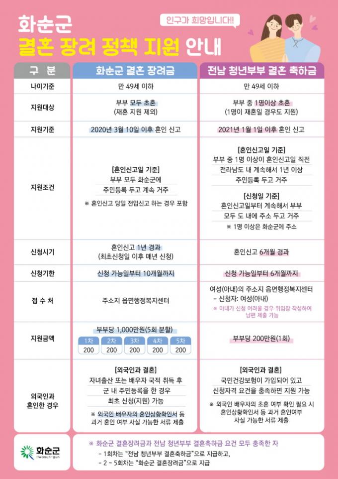 [È£³²´º½º¶óÀÎ = ¼ÀºÈ« ±âÀÚ] ȼø±º(±º¼ö ±¸Ãæ°ï)ÀÌ Àü¶ó³²µµ¿Í ÇÔ²² û³â ½ÅÈ¥ ºÎºÎ¿¡°Ô 200¸¸ ¿øÀÇ °áÈ¥ÃàÇϱÝÀ» Áö¿øÇÑ´Ù. Áö¿ø ´ë»óÀº 2021³â 1¿ù 1ÀÏ ÀÌÈÄ È¥ÀνŰí ÇÑ ¸¸ 49¼¼ ÀÌÇÏÀÎ ºÎºÎ·Î, ÇÑ ¸í ÀÌ»óÀÌ ÃÊÈ¥ÀÌ¿©¾ß ÇÑ´Ù.