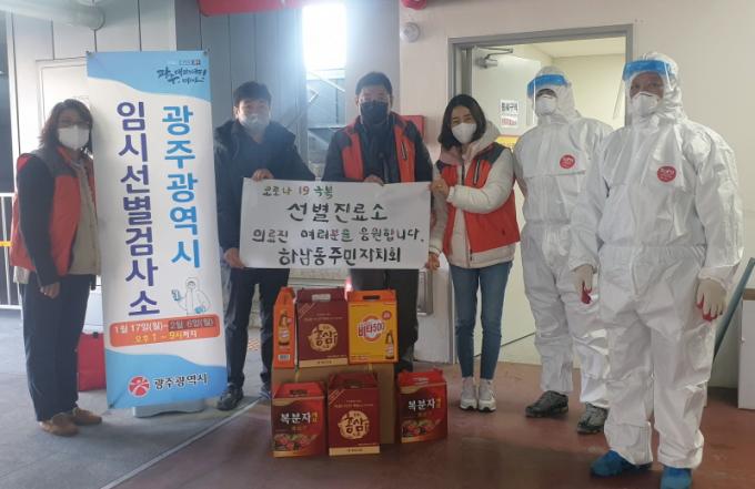 [È£³²´º½º¶óÀÎ = ¼ÀºÈ« ±âÀÚ] ±¤Áֽà ±¤»ê±¸ Çϳ²µ¿ ÁÖ¹ÎÀÚġȸ(ȸÀå ¹ÚÇå±â)°¡ Áö³ 17ÀÏ Çϳ²3Áö±¸ ÁÖÂ÷Ÿ¿ö¿¡ ¼³Ä¡µÈ Àӽà ¼±º°Áø·á¼Ò¸¦ ¹æ¹®ÇÏ¿© ÃßÀ§¿¡ °í»ýÇÏ´Â ÀÇ·áÁø, ÇöÀåÁ¾»çÀÚ¿¡°Ô °¨»ç¿Í ÀÀ¿øÀÇ ¸¶À½À» ´ã¾Æ ÇÖÆÑ°ú ÇÇ·Îȸº¹À½·á µîÀ» Àü´ÞÇÏ¿´´Ù.